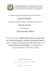 A Assembleia Legislativa do Estado de Santa Catarina convida você para participar da Audiência Pública “Catarina somos todas nós – Pelo direito à vida de todas as mulheres”, um espaço de diálogo, mobilização e compromisso com a proteção e a garantia dos direitos das mulheres catarinenses.