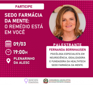A real possibilidade de se alcançar uma qualidade de vida melhor utilizando hormônios produzidos pelo corpo humano foi o tema central de mais uma atividade da agenda especial da Assembleia Legislativa para celebrar o Mês da Mulher. A palestra “SEDO – Farmácia da mente: o remédio está em você”, realizada em modo híbrido na noite desta quarta-feira (9), apresentou o método criado pela psicóloga e especialista em neurociência Fernanda Bornhausen.