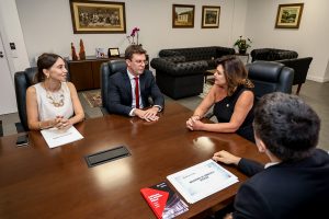 A Defensoria Pública do Estado de Santa Catarina realizou visita institucional à vice-governadora do Estado, Marilisa Boehm, para apresentar iniciativas voltadas ao fortalecimento da proteção às mulheres e à ampliação do acesso à Justiça em todo o território catarinense. Participaram do encontro o subdefensor público-geral, Thiago Burlani Neves, a coordenadora do Núcleo de Defesa da Mulher (NUDEM), Anne Teive Auras, e o coordenador do Núcleo de Execução Penal (NUPEP), Renê Beckmann Jr.