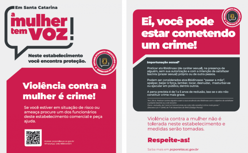 Com o objetivo de dar efetividade ao Programa “A Mulher Tem Voz”, a Polícia Civil de Santa Catarina deflagra, desde o dia 26 janeiro até o dia 23 de fevereiro, a operação “Voz Ativa” em todo o estado. A iniciativa tem como foco ações de conscientização e orientação em estabelecimentos de entretenimento, reforçando a importância da prevenção e do enfrentamento ao constrangimento e à violência contra mulheres, especialmente em um período de maior circulação de pessoas e realização de eventos noturnos.