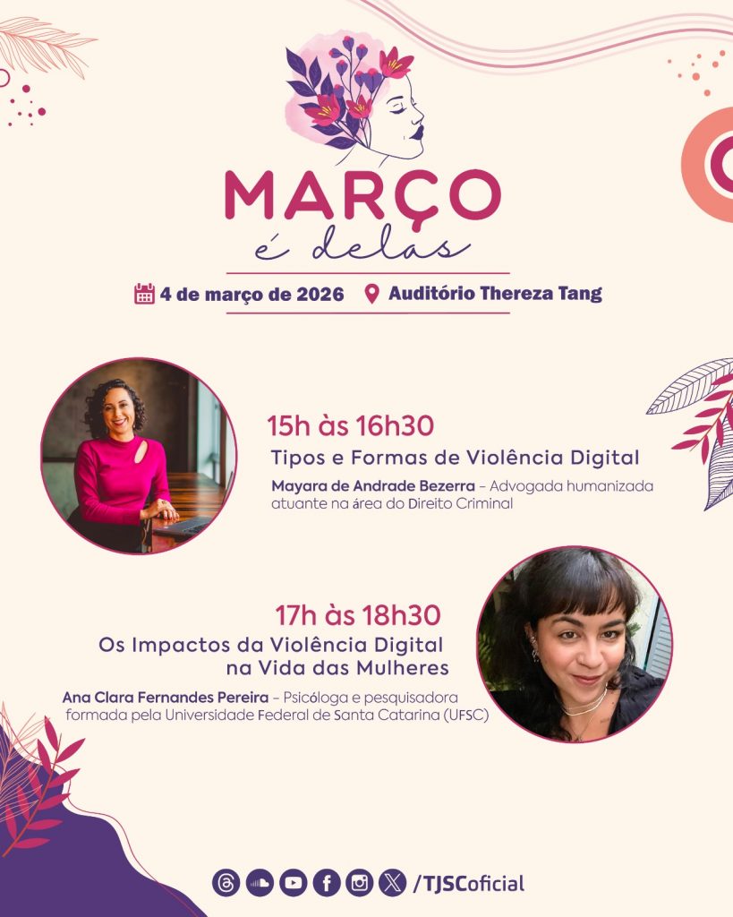No dia 4 de março, das 14h às 19h, o Auditório Tereza Tang, no 7º andar da Torre I do TJSC, recebe a Oficina de Violência Digital contra as Mulheres e suas Consequências. A advogada Mayara de Andrade Bezerra e a psicóloga Ana Clara Fernandes Pereira conduzem as exposições.