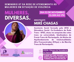 Convidamos você para um importante momento de diálogo e fortalecimento da rede de proteção às mulheres em situação de violência. O encontro contará com a presença especial de Mirê Chagas, assistente social e educadora social, reconhecida nacionalmente por sua atuação nas pautas trans e de direitos humanos.